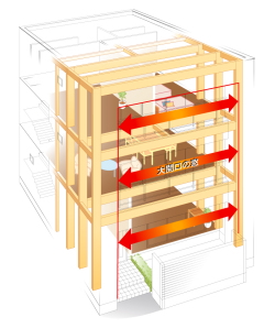 2階に耐力壁が増えれば、できる限り1階にも柱がほしい。しかし、一般的な住宅ではLDKが1階に配置することとなり、柱を容易に配置できない。 |